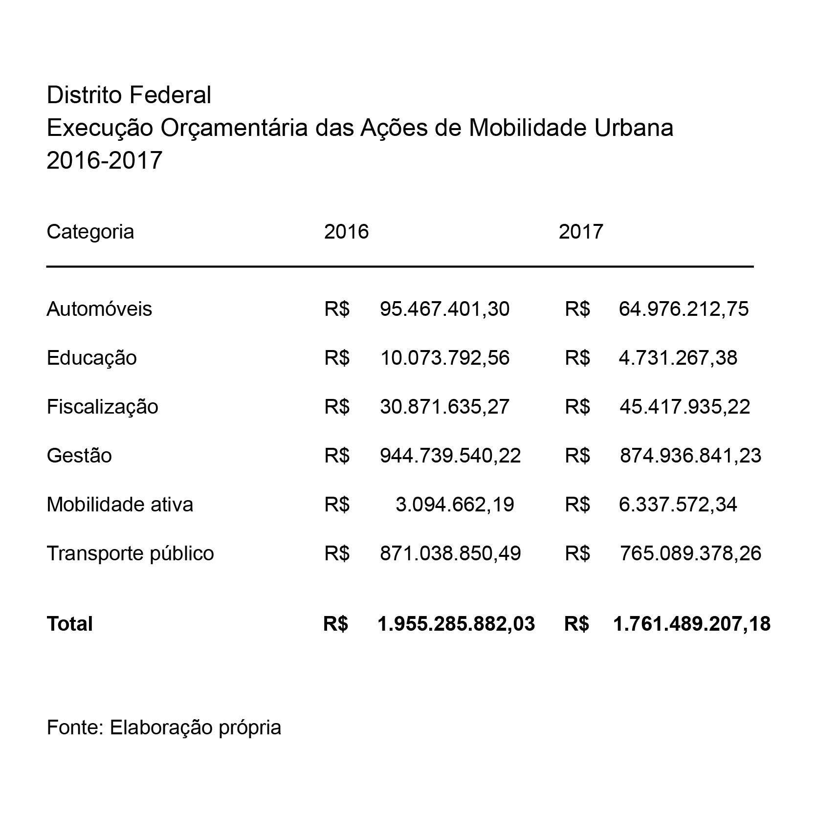 Apesar da categoria transporte público receber a maior parte dos recursos, é importante destacar que as despesas se concentraram nos gastos diretamente ligados ao subsídio da alta tarifa do DF, representando 71,1% em 2016 e 66,9% dos gastos em 2017. Os demais custos ligados ao transporte público dizem respeito à manutenção e investimento. Ou seja, se gasta mais para manter o sistema funcionando como está – de forma excludente a acentuando as desigualdades – do que para ampliar a sua capacidade e qualidade, como tinha sido prometido.