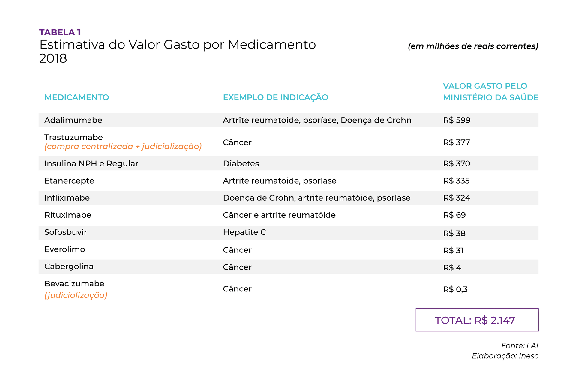 A questão é que o impacto da suspensão dos contratos se dará, principalmente, no longo prazo. O Instituto de Estudos Socioeconômicos (Inesc) estimou, com dados obtidos via Lei de Acesso a Informação (LAI), o gasto do ministério em 2018 com alguns medicamentos objeto das PDPs suspensas, seja por compra centralizada ou judicialização. Somados, eles representam cerca de R$ 2,1 bilhões, como mostra a tabela a seguir: