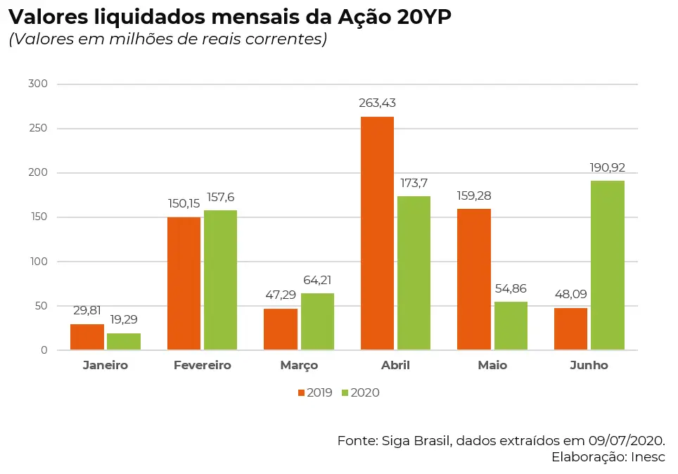 A pesquisa do Inesc também apontou que, nos meses em que a pandemia já estava instaurada nos territórios indígenas, os valores liquidados foram significativamente menores que os liquidados em igual período de 2019. Em abril e maio, a queda chega à casa dos R$ 100 milhões. Somente em junho esse quadro se reverte, o que indica a demora para a efetivação de uma atuação robusta para conter o vírus.