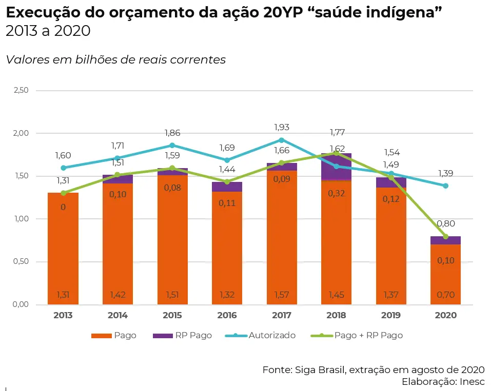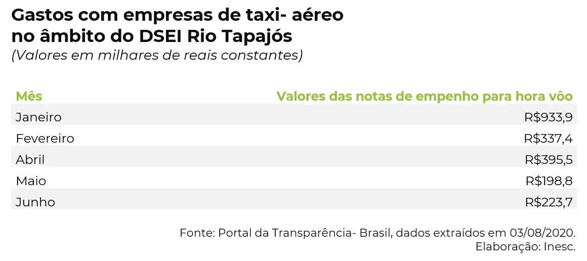 Como exemplo da redução dos gastos, o Inesc trouxe o caso de dois Distritos Sanitários Especiais Indígenas mais afetados pela pandemia: DSEI Leste-RR e DSEI- Rio Tapajós. Constatou-se que não houve aumento significativo de gastos em itens essenciais para o enfrentamento do novo coronavírus nos meses em que a pandemia já estava instaurada nas comunidades. Os gastos com táxi-aéreo, utilizados para transporte de paciente no âmbito do DSEI -Rio Tapajós, foram mais altos no começo do ano do que quando a pandemia já estava instaurada.