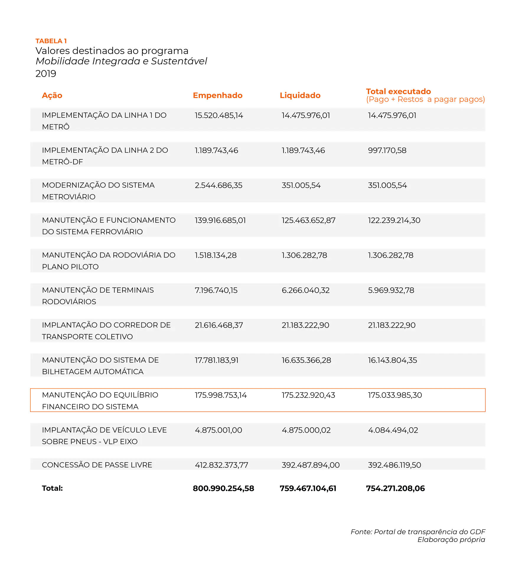 Esse total equivale a todo o programa orçamentário mobilidade integrada e sustentável, conforme dados da tabela 1. O que o governador Ibaneis joga na conta da subvenção é, na verdade, os recursos para toda a infraestrutura do TPU, como corredores exclusivos de ônibus e manutenção dos terminais rodoviários, por exemplo.