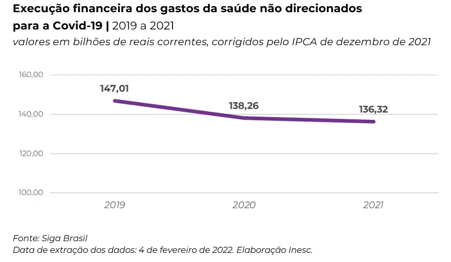 Do total da execução financeira com a função saúde em 2021, sem considerar os gastos para a Covid-19, essa área também registrou cortes e já acumula uma perda de R$ 10,7 bilhões desde 2019 ou -7% em dois anos. Para 2022, foi aprovada uma dotação inicial da saúde de R$ 149,4 bilhões, valor que é 18% menor que a execução financeira de 2021 (redução equivalente a R$ 32,8 bilhões). Deste modo, o orçamento federal ignora a situação de desfinanciamento enfrentada pelo SUS, antes da pandemia, fato que tende a piorar por conta da demanda reprimida de pacientes que voltarão a procurar o sistema neste ano, porque tiveram suas cirurgias eletivas e exames de maior complexidade adiados, bem como a interrupção dos seus tratamentos de doenças crônicas.