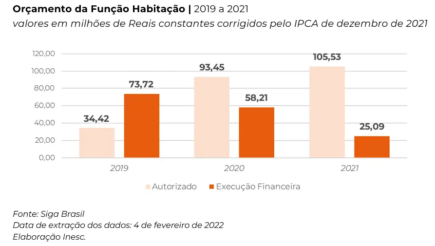 Com um déficit habitacional de mais de 6 milhões de moradias, o governo federal não alocou nenhum centavo para a habitação de interesse social em 2021. Em 2020, tampouco. Em 2019, foram gastos cerca de R$ 18 milhões, mas foram pagamentos de despesas contratadas em anos anteriores.