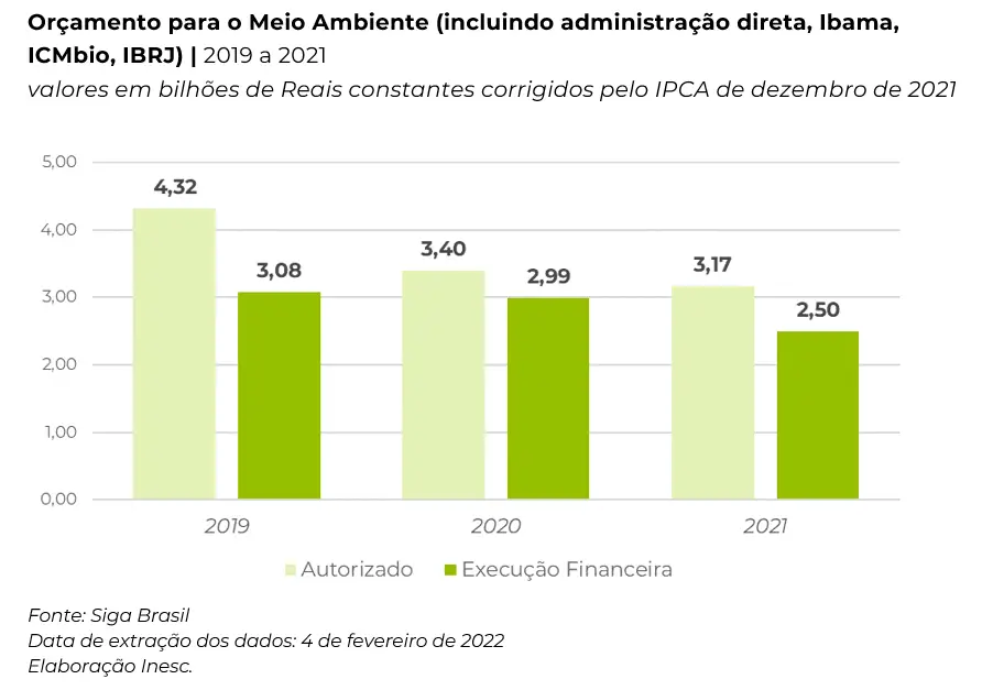 O orçamento executado para o meio ambiente em 2021 foi o menor dos últimos três anos: foram gastos apenas R$ 2,49 bilhões, comparado a R$ 3 a 4 bilhões gastos em anos anteriores, para todos os órgãos ambientais (Ministério do Meio Ambiente, Ibama, ICMBio, Jardim Botânico), incluindo também o Fundo Nacional de Mudanças Climáticas (FNMC).