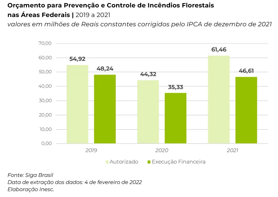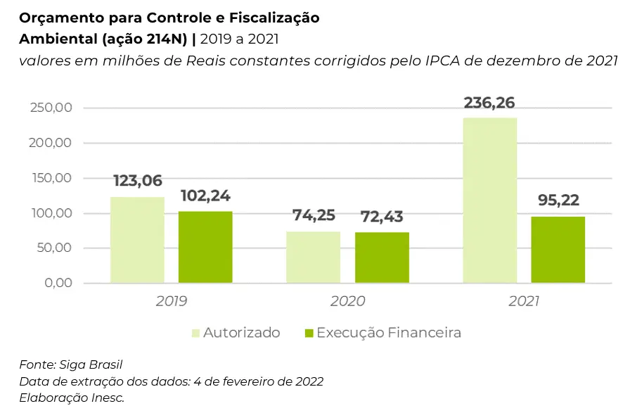 Para 2022, houve a manutenção de valores mais elevados para as ações de fiscalização e prevenção de incêndios florestais, embora o INPE já ter anunciado o crescimento da taxa de desmatamento neste ano de uma área 419,3% maior em relação a janeiro de 2021.