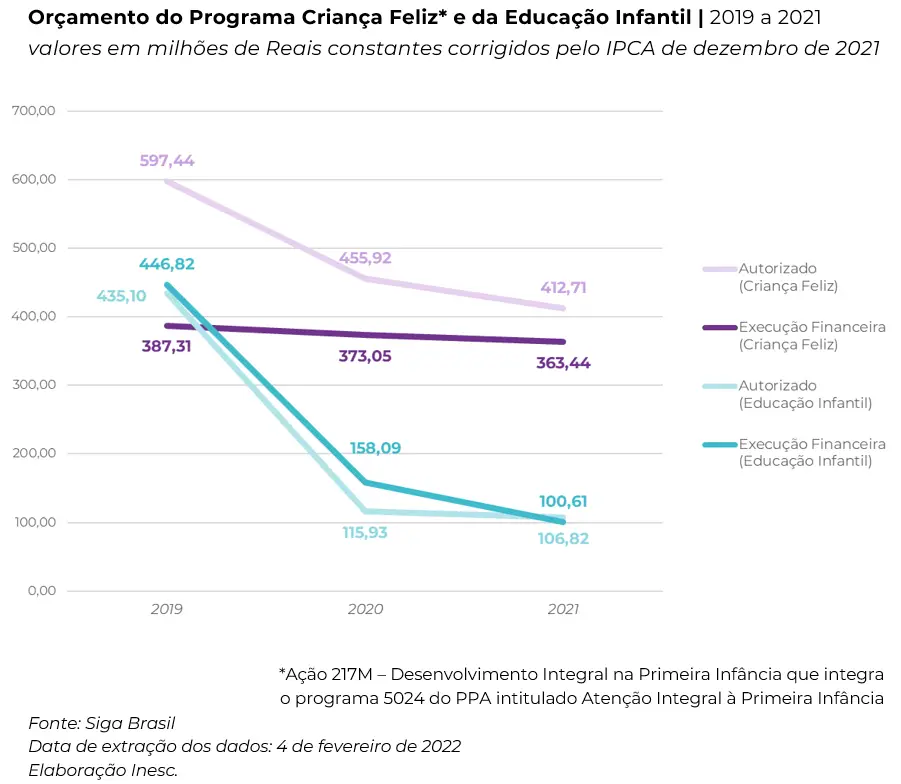 A execução financeira da subfunção de Assistência à Criança e ao Adolescente caiu 28% em termos reais, passando de R$ 531 milhões para R$ 382 milhões entre 2019 e 2021. Essa área chegou a ter 30 ações em 2012, mas em 2021 só havia recursos para três: Criança Feliz – que absorveu 95% dos recursos; Construção, Reforma, Equipagem e Ampliação de Unidades de Atendimento Socioeducativo, e Promoção e Defesa de Direitos para Todos (esta não teve recurso executado).