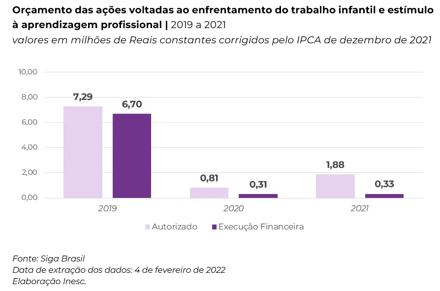 A educação infantil viu seu orçamento encolher 77%: eram R$ 446 milhões em 2019 que viraram R$ 100 milhões em 2021. E os recursos destinados para combater o trabalho infantil caíram 20 vezes: foram executados R$ 6,7 milhões em 2019 e somente R$ 332 mil em 2021. Considerando que existem cerca de 1,8 milhão de crianças nessa situação, isso equivale a 19 centavos por criança para o ano.
