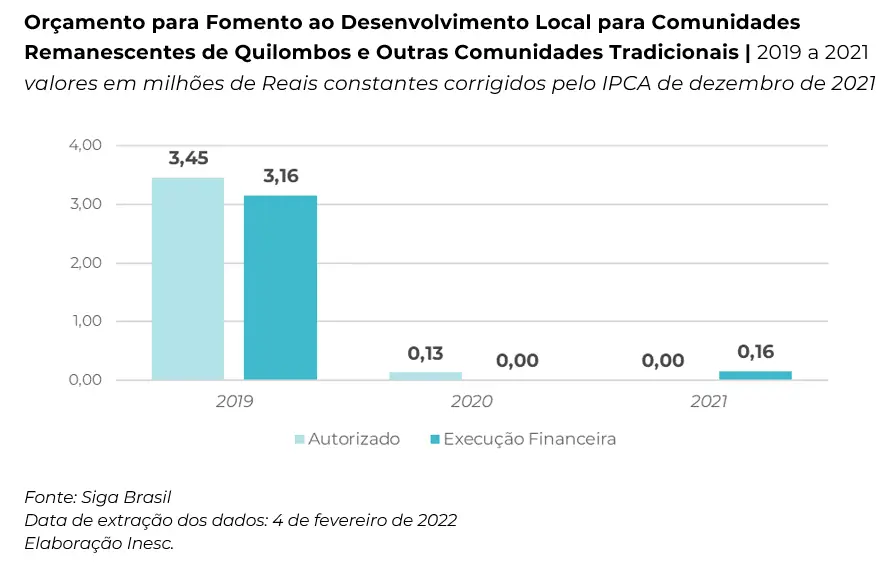 Urge implementar ações de demarcação de territórios, já que, em 2021, foram gastos apenas R$ 164 mil em atividades de Reconhecimento e Indenização de propriedades Quilombolas, além de R$ 792,4 mil de compromissos assumidos em anos anteriores. Para 2022, segue ínfima a alocação de recursos para demarcação (R$ 505 mil), e mesmo quando há recursos – como é o caso dos R$ 200 milhões advindos de créditos extraordinários para a Ação 2792, de Distribuição de Alimentos a Grupos Populacionais Específicos – pouquíssimo dinheiro (R$ 18,8 milhões) foi, de fato, autorizado para políticas públicas com essa finalidade.