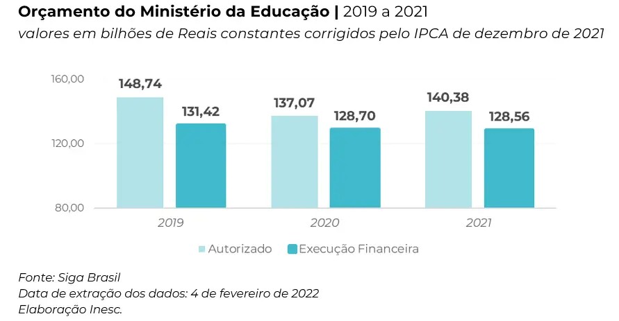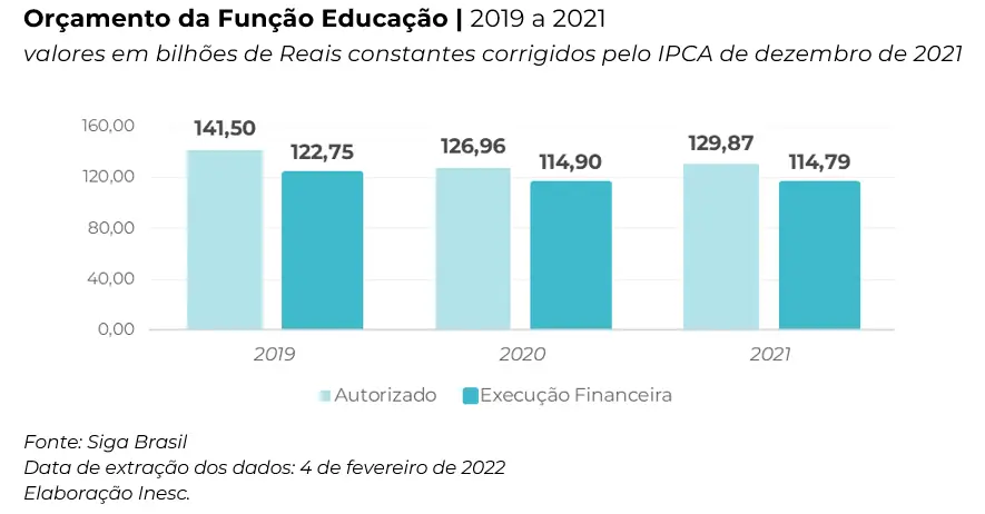 Mesmo diante desse cenário, não houve esforço orçamentário para atuar na redução do prejuízo escolar para os estudantes da rede pública. Desde o primeiro Balanço Geral do Orçamento da União, o Inesc vem denunciando o desfinanciamento da educação, e em 2021 não foi diferente. A execução financeira da função educação, entre 2019 e 2021, caiu R$ 8 bilhões em termos reais. O valor autorizado para 2021 foi cerca de R$ 3 bilhões a mais que em 2020, no entanto, a execução financeira foi menor. Destaca-se que 2021 foi um ano de muitos desafios, com o aumento das contaminações e mortes por Covid-19 no primeiro semestre.