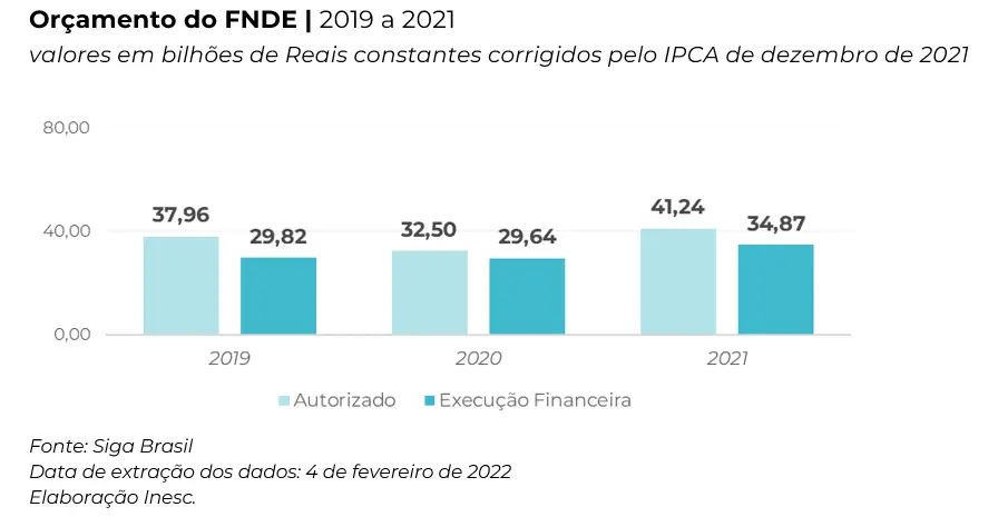 No caso do Fundo Nacional de Desenvolvimento da Educação (FNDE), responsável por políticas fundamentais como a aquisição de livros didáticos, transporte escolar, alimentação escolar, entre outros, como se pode observar no gráfico 9, mesmo que os valores autorizados sejam mais altos, ao longo dos três anos, a execução ficou sempre inferior. No caso de 2021, foram gastos cerca de R$ 6,4 bilhões a menos do que o recurso disponível.