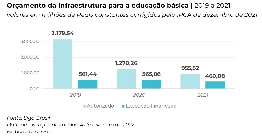 Infraestrutura das escolas A ação que prevê a melhoria da infraestrutura das escolas, tão necessária nesse momento de pandemia tem tido uma execução irrisória e, desde 2020, o autorizado vem caindo, até mesmo para 2022, quando acontece o retorno às aulas.