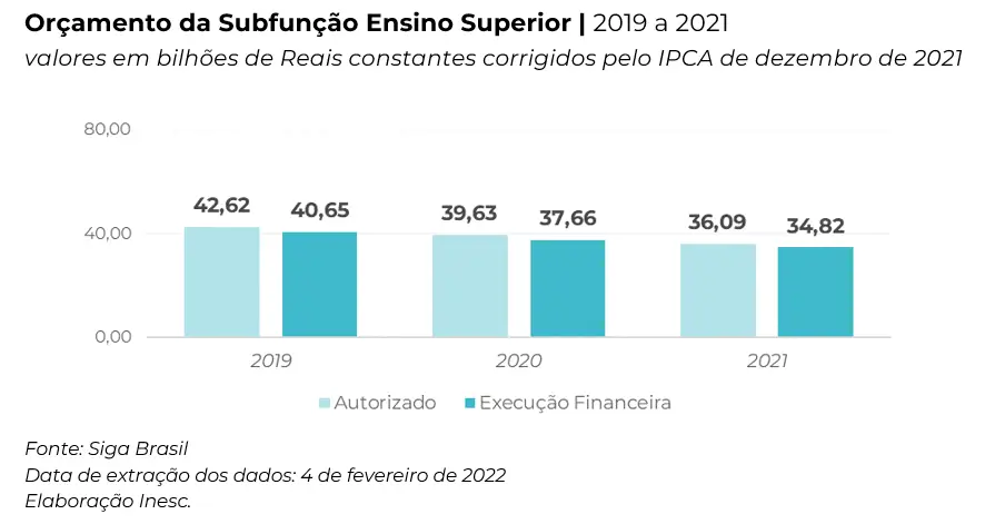 Já o ensino superior tem sido atacado sistematicamente ao longo dos anos de governo Bolsonaro, seja com ameaças à pesquisa e à ciência, seja com cortes de recursos. Há um projeto político para enfraquecimento dessas instituições, conforme o gráfico a seguir: