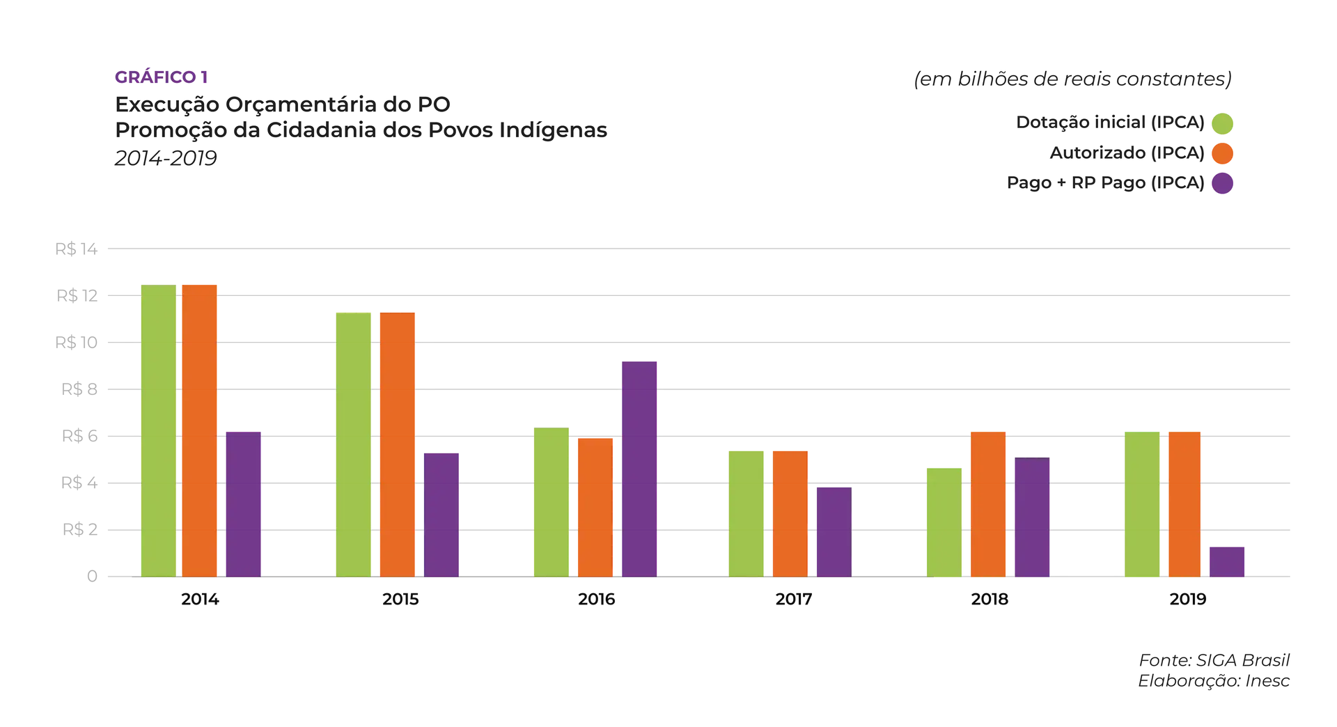 Além disso, esse mesmo Programa vem sofrendo há anos com a falta de investimentos (gráfico a seguir): com as dotações iniciais e orçamentos autorizados já em queda desde 2014, a execução orçamentária permanece baixa desde então, oscilando entre os 5 e 6 milhões de reais, salvo pequena exceção em 2016. Os cortes orçamentários atuais, assim, vêm para terminar de sufocar os parcos esforços de incluir a luta das mulheres indígenas nas políticas públicas federais.