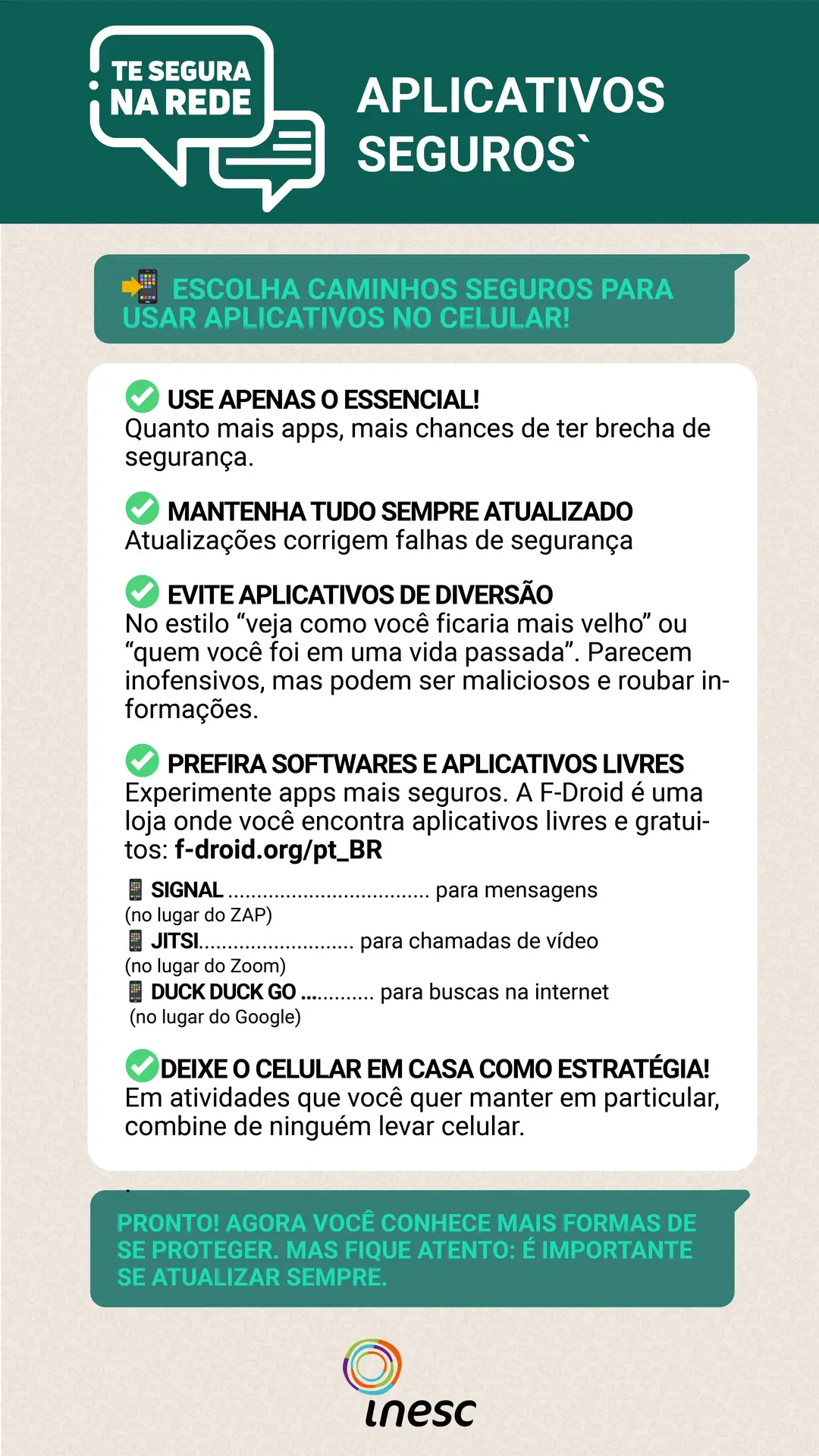 Nos tópicos abaixo, você encontra orientações sobre como utilizar celulares, aplicativos e sites de forma mais consciente e segura. Disponibilizamos áudios, vídeos, cards e gifs com dicas de segurança para serem difundidos no WhatsApp e nas redes sociais.