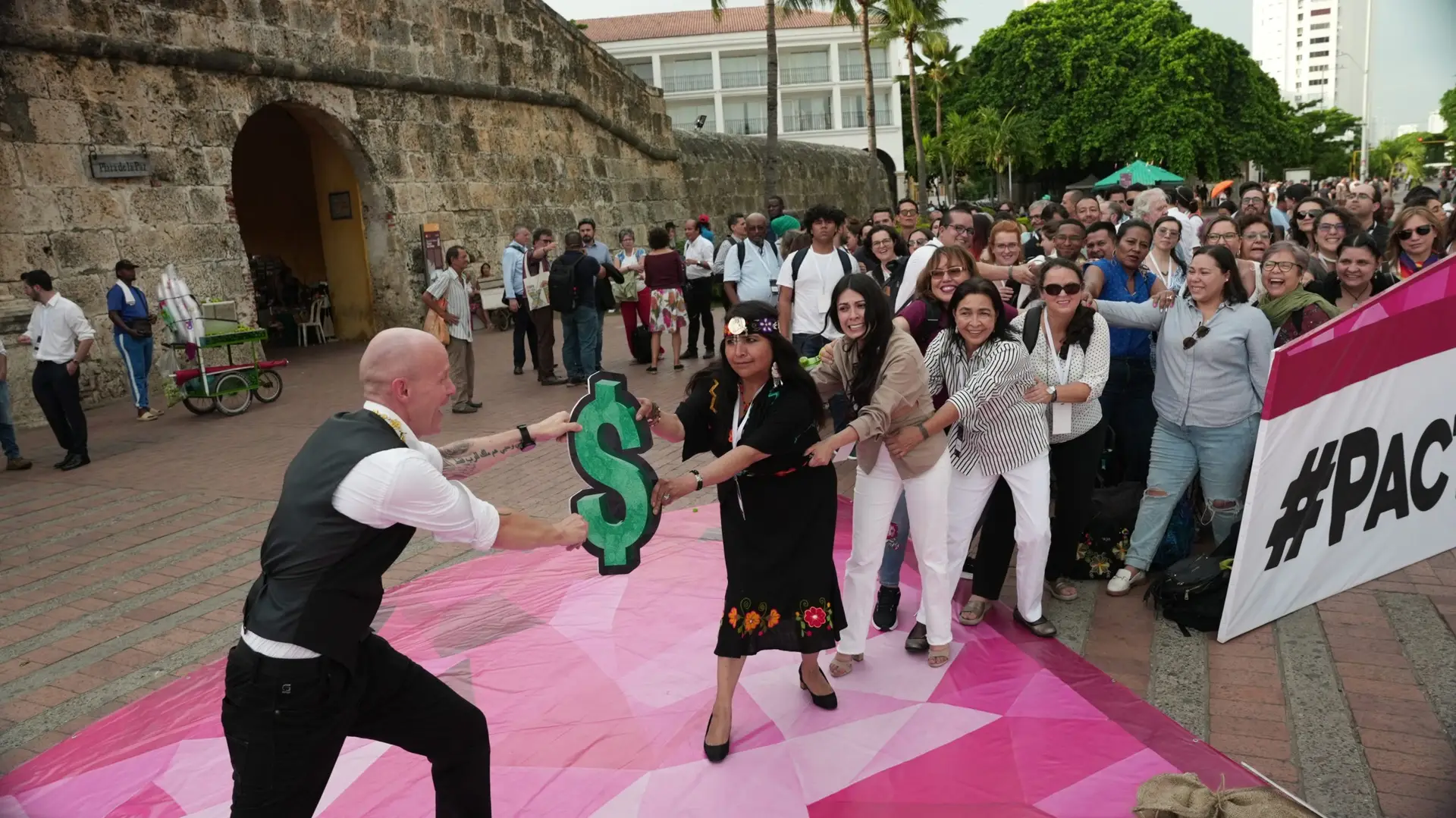 “Pacto fiscal já!”. No dia 26/7, véspera do início da cúpula ministerial, representantes de mais de 50 entidades da sociedade civil da América Latina e Caribe fizeram um ato público no centro histórico de Cartagena, com uma instalação na frente da emblemática Torre del Reloj. As (os) ativistas exigiam de seus governantes “redistribuir o bolo da riqueza”, já que os “10% mais ricos acumulam 77% de toda a riqueza da região”.
