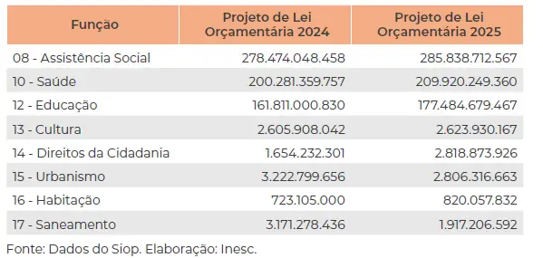 Conforme pode ser observado, duas funções, Urbanismo e Saneamento, viram seus orçamentos propostos diminuírem 13% e 40% respectivamente entre 2024 e 2025. Além disso, das demais funções mencionadas, apenas a educação e direitos da cidadania não ficaram aquém do reajuste proposto pelo arcabouço fiscal. As demais, sequer atingiram o reajuste de 6,73%, que seria o Índice de Preços ao Consumidor Amplo (IPCA) de junho de 2023 a junho de 2024, 4,23%, somados ao aumento das receitas que foi de 7,8%. No entanto, há um redutor dizendo que esse aumento real só poderá ser aplicado ao orçamento até o limite de 2,5%, reduzindo o reajuste do PLOA a 6,73%.