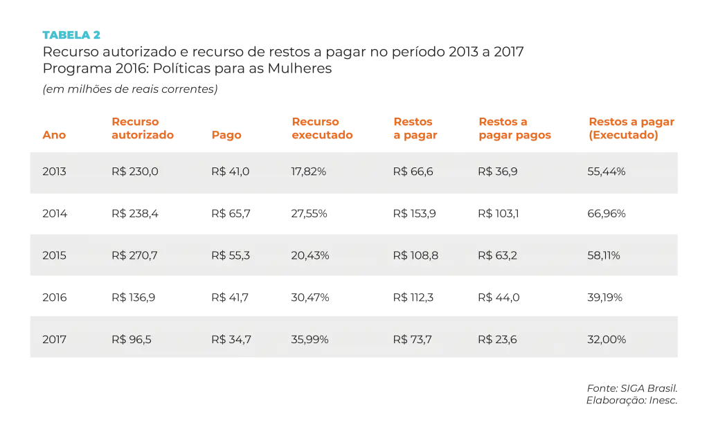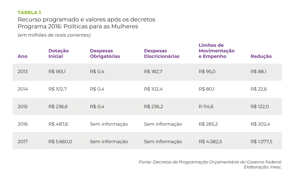 O Inesc[i] participou do estudo com o tema do orçamento público para as mulheres no Brasil, considerando especificamente o programa Políticas para as Mulheres: Promoção da Autonomia e Enfrentamento a Violência, no período de 2013 a 2017. Foram analisados os seguintes documentos oficiais: