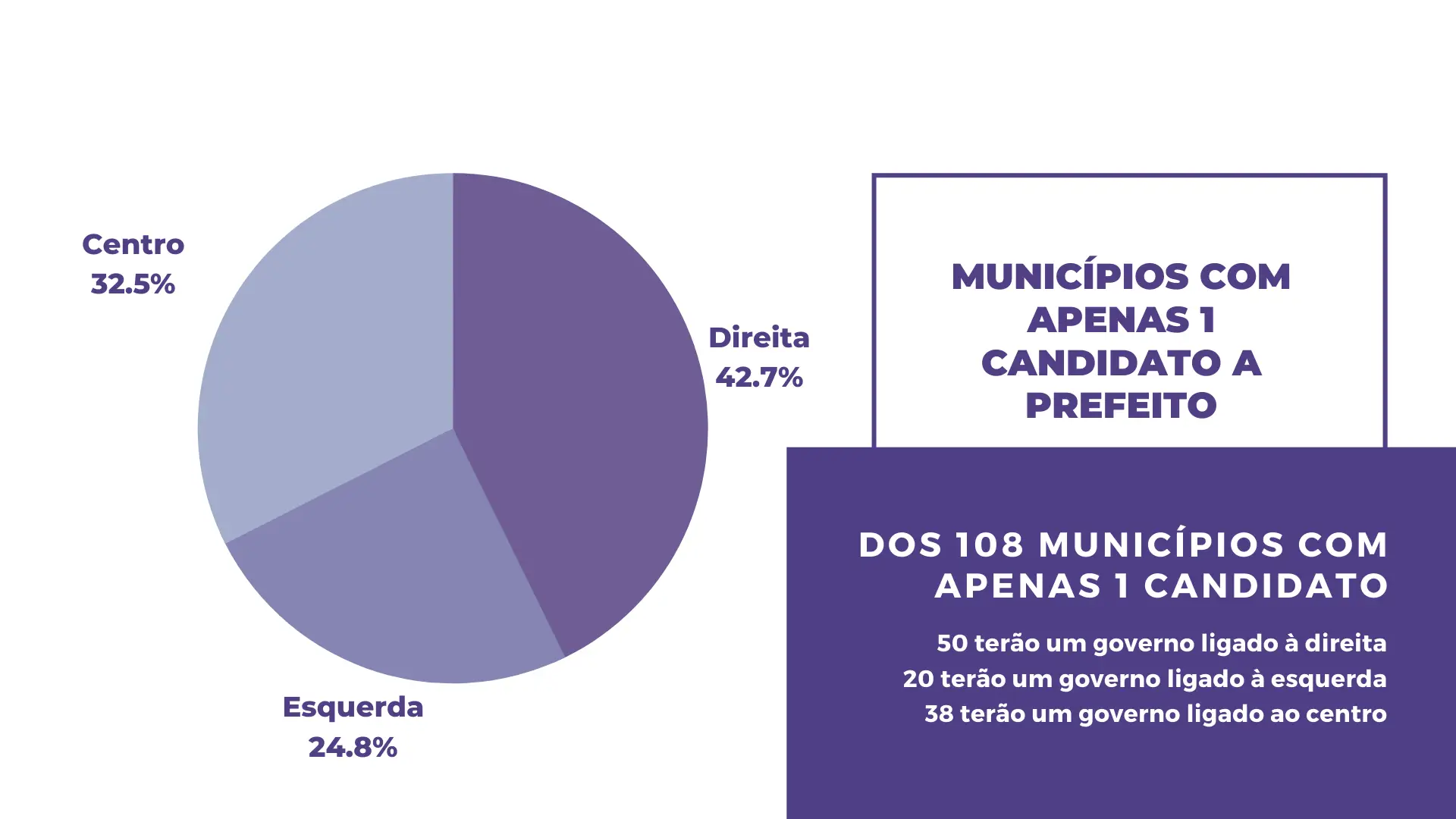 Em 108 municípios brasileiros, os perfis dos novos governantes municipais já estão definidos antes mesmo das eleições. Considerando o espectro político acima, dos 108 casos em que há apenas um(a) candidato(a), 50 possuem um(a) candidato(a) da direita; 38 possuem uma candidatura ligada ao centro; e 20 possuem um(a) candidato(a) da esquerda.
