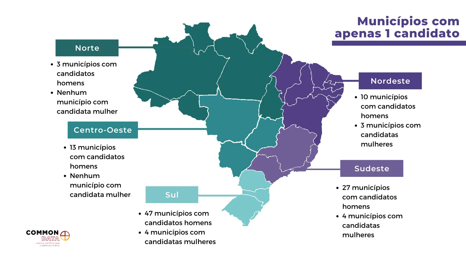 - 3 destes municípios com apenas uma candidata mulher se encontram no Rio Grande do Norte; 1 no Piauí; 1 em Santa Catarina; 1 no Paraná; e 2 no Rio Grande do Sul.