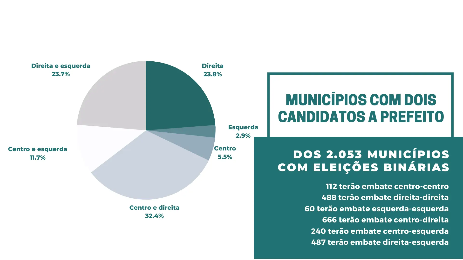 São 2.053 municípios brasileiros que irão enfrentar esse cenário dicotômico nas eleições para o Executivo municipal. Em 112 municípios, a disputa se dará somente entre candidatos de partidos de centro; em 488 a disputa será somente entre partidos de direita; e, em 60 municípios, somente entre partidos de esquerda. Nos confrontos que envolvem dois espectros políticos diferentes, temos 666 municípios em que a disputa será entre centro e direita; 487, entre direita e esquerda; e 240, entre centro e esquerda.