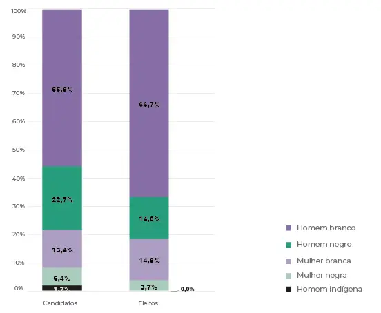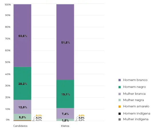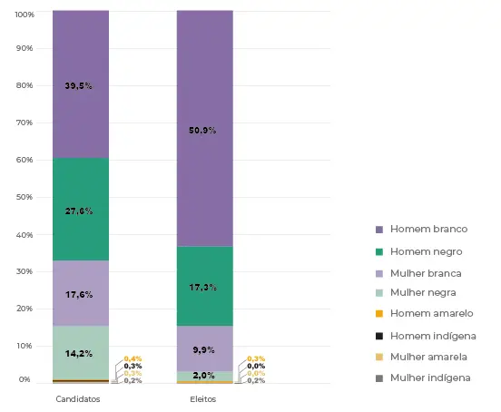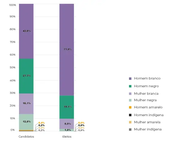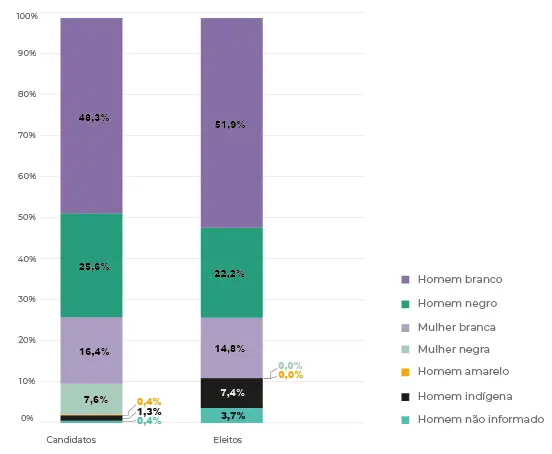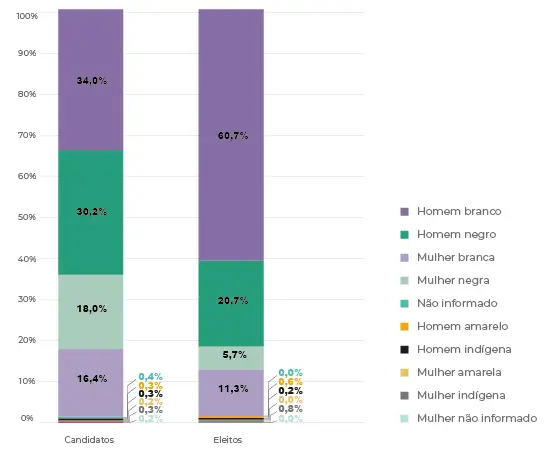 Naquele ano, foi possível constatar o tímido percentual de candidaturas da população negra, bem como o baixíssimo número de pessoas pardas e pretas que conseguiram ser eleitas, conforme os dados abaixo: