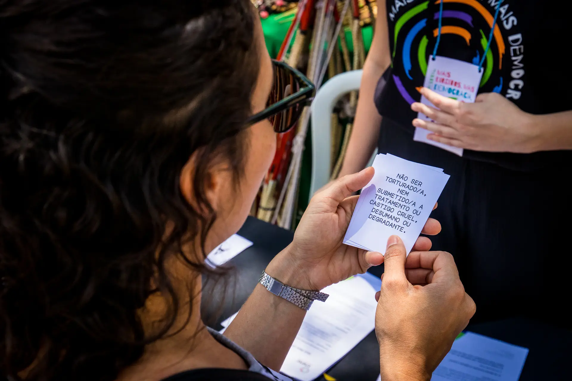 Funcionárias e funcionários do Inesc passaram o dia na Banquinha dos Direitos Humanos. Entre jogos, distribuição gratuita de publicações feitas pela instituição e outros brindes, o objetivo da banquinha era explicar de forma lúdica e simples os temas principais da instituição: direitos humanos, democracia e orçamento público. Durante todo o dia, o local permaneceu rodeado de pessoas, principalmente jovens que passavam pela praça. A estimativa dos organizadores é que, só pela banquinha, tenha passado cerca de 200 pessoas.