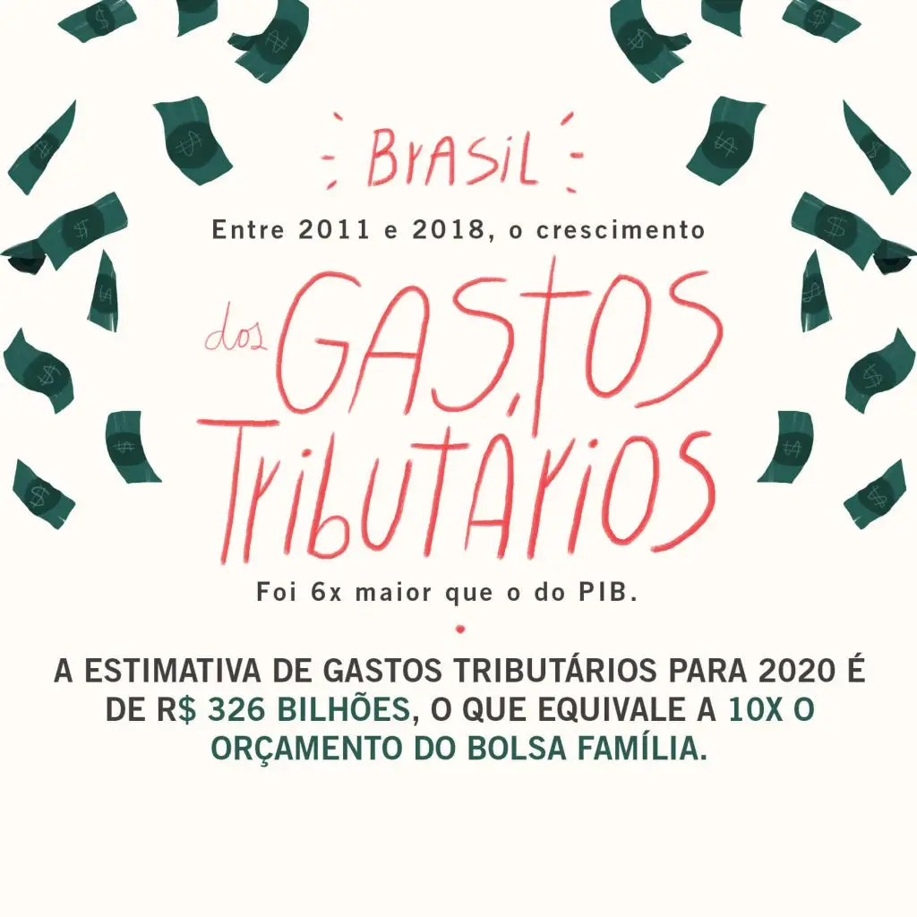 Como destacado anteriormente, o Brasil possui um dos melhores relatórios de gastos tributários da região, o Demonstrativo de Gastos Tributários, divulgado anualmente pela Receita Federal. A cada ano, a União gasta cerca de 20% de sua arrecadação e 4% do seu PIB com Gastos Tributários. A estimativa de gasto para 2020 é de R$ 326 bilhões de reais, um valor muito próximo ao chamado “rombo da previdência social”. Os benefícios abrangem diversos setores, desde produtores de bebidas açucaradas, como os refrigerantes, até a produção de combustíveis fósseis, privilegiando grandes multinacionais que atuam no país.