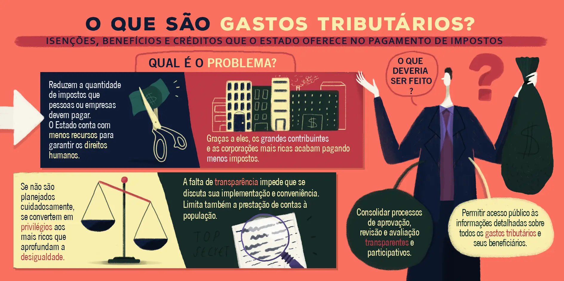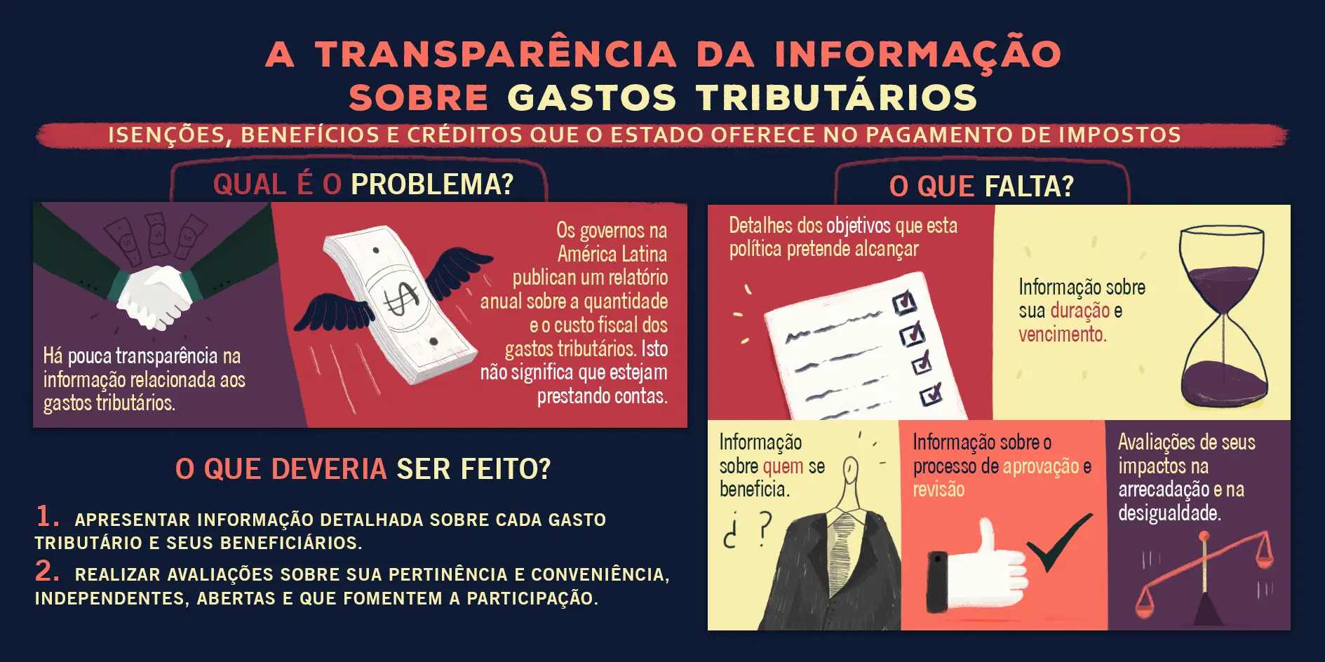 Apesar de dispor de relativamente bons relatórios de gastos tributários, o Brasil possui alguns dos mesmos problemas do resto da região no que diz respeito à transparência e à prestação de contas. O governo concede incentivos fiscais com a justificativa de que eles podem estimular investimentos, gerar empregos e contribuir com o crescimento da economia. Porém, não avalia se os benefícios estão realmente promovendo o desenvolvimento econômico e os ganhos sociais que prometem. Além disso, não sabemos quem recebe esses incentivos e nem o valor, pois estão protegidos por sigilo fiscal.