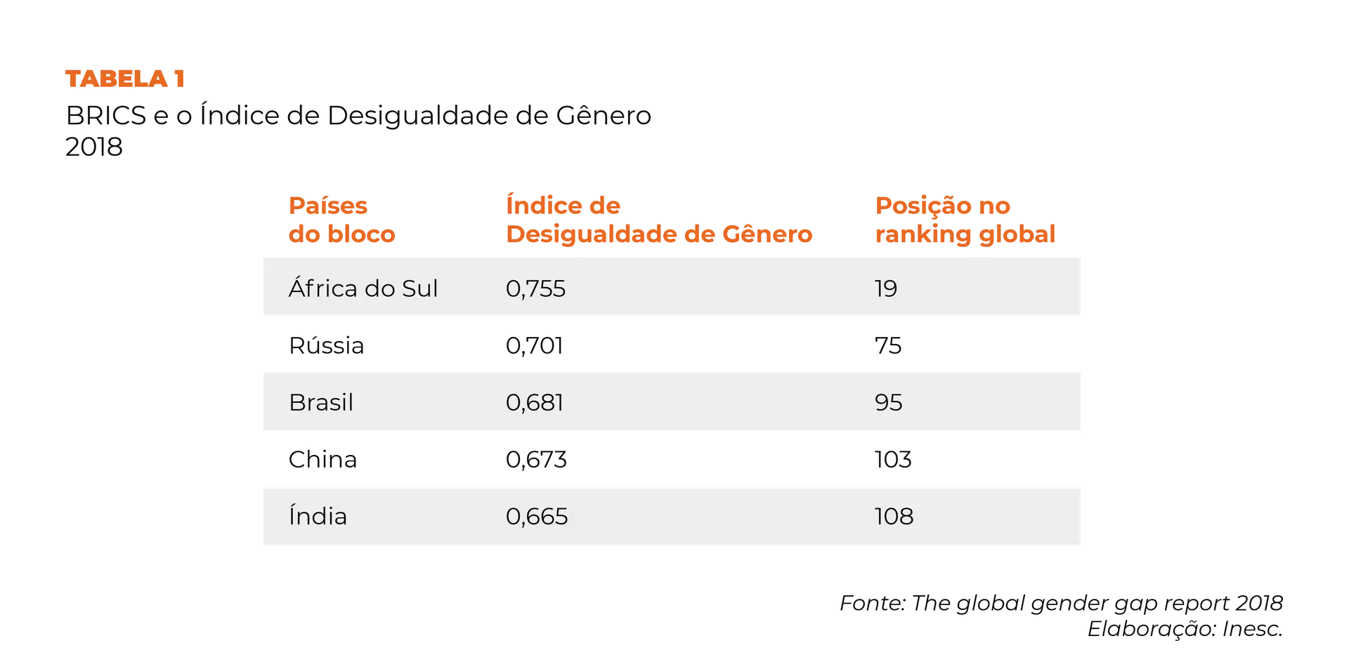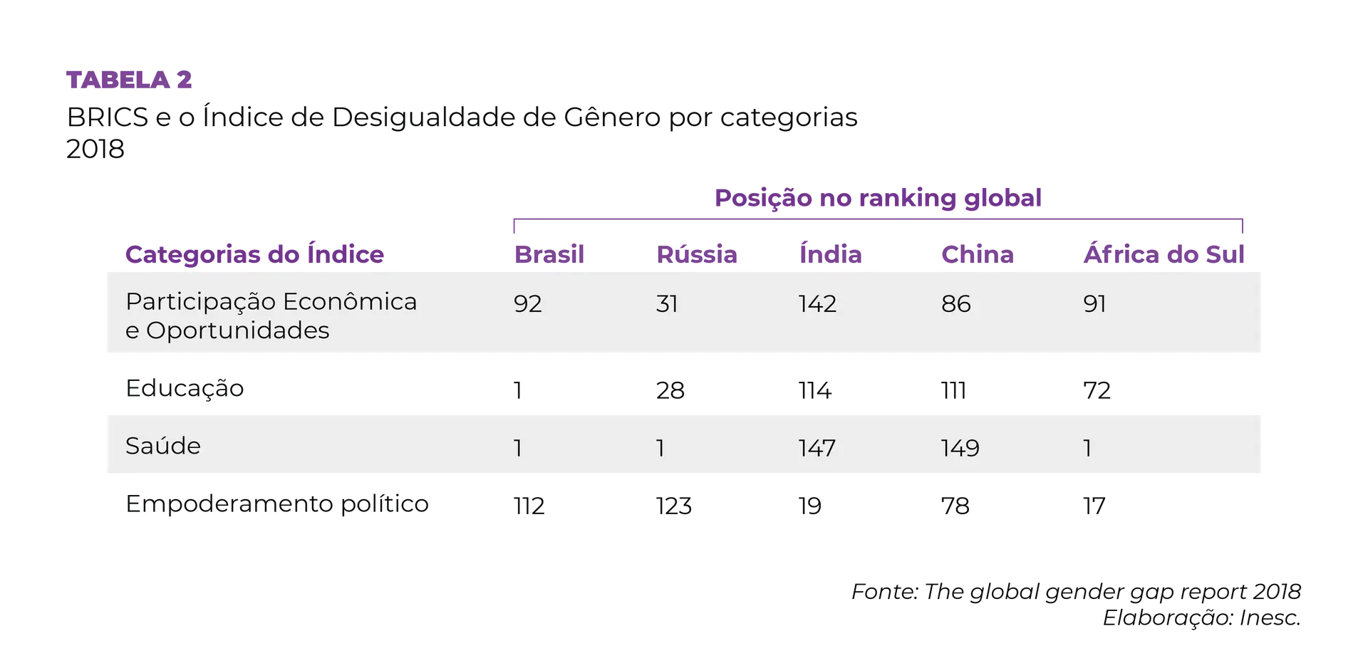 Conforme pode ser observado nas tabelas 1 e 2, no geral, os países do Brics não estão entre os mais iguais do mundo em termos de gênero. A melhor posição é da África do Sul, que ocupa o 19º lugar. Isso se deve essencialmente aos quesitos de saúde e de empoderamento político, pois, em geral, as mulheres estão presentes no Executivo e no Legislativo. Ainda é preciso melhorar as dimensões de mercado de trabalho e de educação.