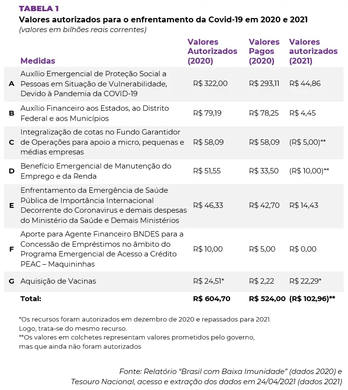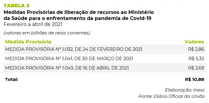 Janeiro e fevereiro de 2021: em um cenário de aumento diário da mortalidade decorrente da Covid-19, o governo federal seguiu sem orçamento para a pandemia, priorizando pautas como a autonomia do Banco Central e a Reforma Administrativa. Contudo, houve autorização de R$ 2,8 bilhões à saúde por meio de Medida Provisória. Outras medidas se sucederam ao longo de março e abril de 2021, totalizando R$ 10,88 bilhões, como pode ser observado na Tabela 2.