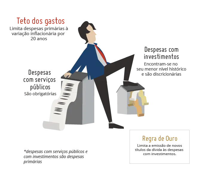 A política do ‘teto dos gastos’ foi adotada em dezembro de 2016 por meio da Emenda Constitucional (EC) nº 95. Ela prevê que, durante 20 anos, as despesas primárias do orçamento público ficarão limitadas à variação inflacionária. Isso quer dizer que, no período, não ocorrerá crescimento real das despesas primárias, que são agrupadas em duas grandes categorias, as despesas de custeio (com serviços públicos) e as despesas com investimentos. A EC 95 não só congela, mas de fato reduz os gastos sociais em porcentagem per capita (por pessoa) e em relação ao PIB, à medida que a população cresce e a economia se recupera, como é comum nos ciclos econômicos.