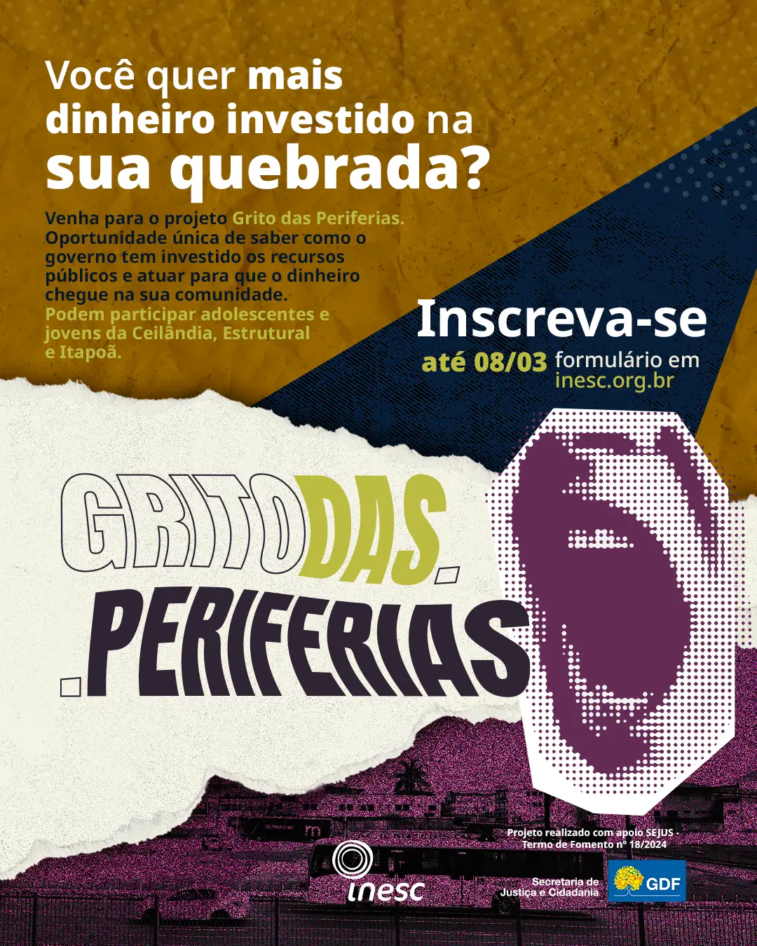 As inscrições seguem abertas até as 23h59 do dia 8 de março, com a divulgação dos selecionados prevista para 14 de março. O projeto é uma parceria entre o Inesc e a Sejus-DF (Termo de Fomento 018/2024), viabilizada por meio de apoio de emendas parlamentares dos deputados Fábio Félix e Max Maciel.