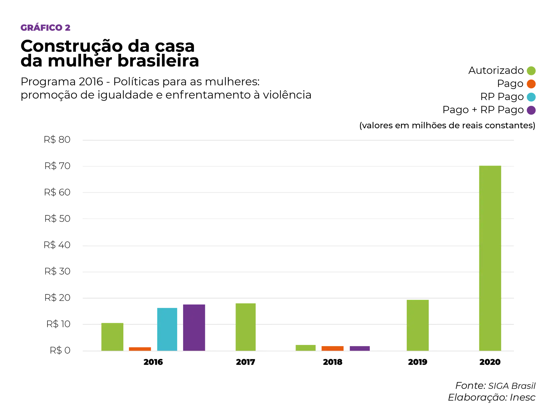 “Em 2019, o recurso foi recomposto, tendo sido autorizados quase 300 milhões para o Programa 2016: Políticas para as Mulheres: Promoção da Igualdade e Enfrentamento a Violência. No entanto, a execução foi baixíssima, menos de 10%, sendo cerca de 28 milhões em recursos pagos e 46 milhões de restos a pagar, ou seja, recursos comprometidos com contratos de anos anteriores pagos em 2019.”