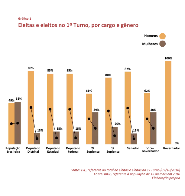 A eleição de novas candidaturas, de várias matizes ideológicas do espectro político, foi a tônica do 1º turno das Eleições 2018. Mas ainda que a chamada “renovação política” tenha implicado mudanças na correlação de força dos partidos, a representatividade continuou muito aquém da realidade da sociedade brasileira. Um exemplo disso é que das 13 mulheres que disputavam o governo nos estados, nenhuma foi eleita no primeiro turno e apenas uma ainda concorre no segundo.