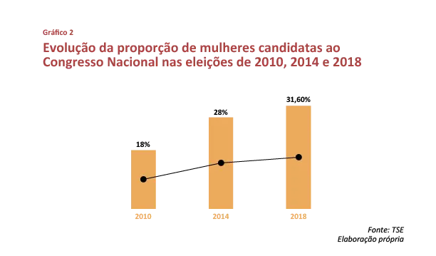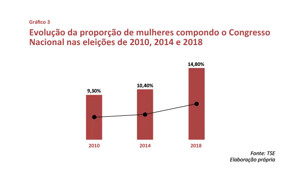 Se considerarmos o Parlamento como um todo (deputados federais e senadores), o Congresso Nacional terá 15% de mulheres nos próximos quatro anos, um aumento importante em relação a 2010 (9%) e 2014 (10%), mas muito aquém da cota de 30% de candidatas – e pior ainda considerando que metade da população brasileira é composta de mulheres. Em números absolutos, dos 567cargos, foram eleitas somente 84 mulheres frente a 483 homens.