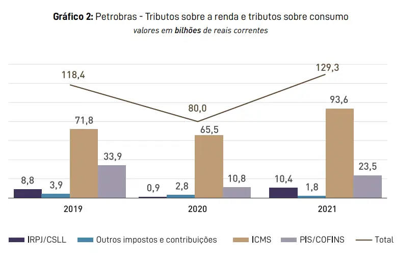 Em 2021, a Petrobras pagou apenas R$ 10,4 bilhões em impostos sobre a renda. Enquanto isso, o consumidor brasileiro paga 10 vezes mais tributos sobre a gasolina, gás natural, diesel e outros subprodutos do petróleo, totalizando R$ 117 bilhões em 2021 (soma ICMS, Cide e PIS/COFINS).