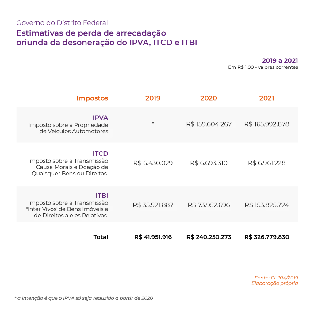 No projeto de lei 104/2019, enviado à CLDF também pelo governador, a proposta de redução dos impostos foi detalhada da seguinte forma: