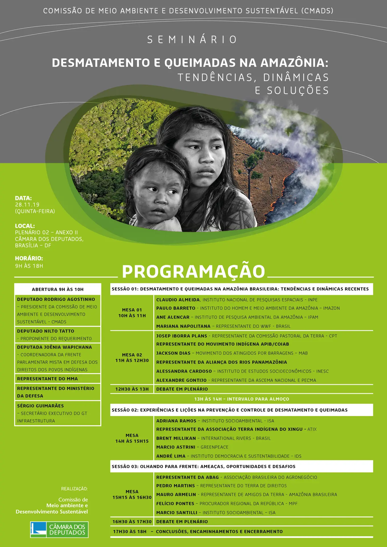 Esse cenário crítico na região amazônica será o tema do seminário “Desmatamento e Queimadas na Amazônia: Tendências, Dinâmicas e Soluções”, que será realizado pela Comissão de Meio Ambiente e Desenvolvimento Sustentável (CMADS) da Câmara dos Deputados, na quinta-feira, dia 28 de novembro.