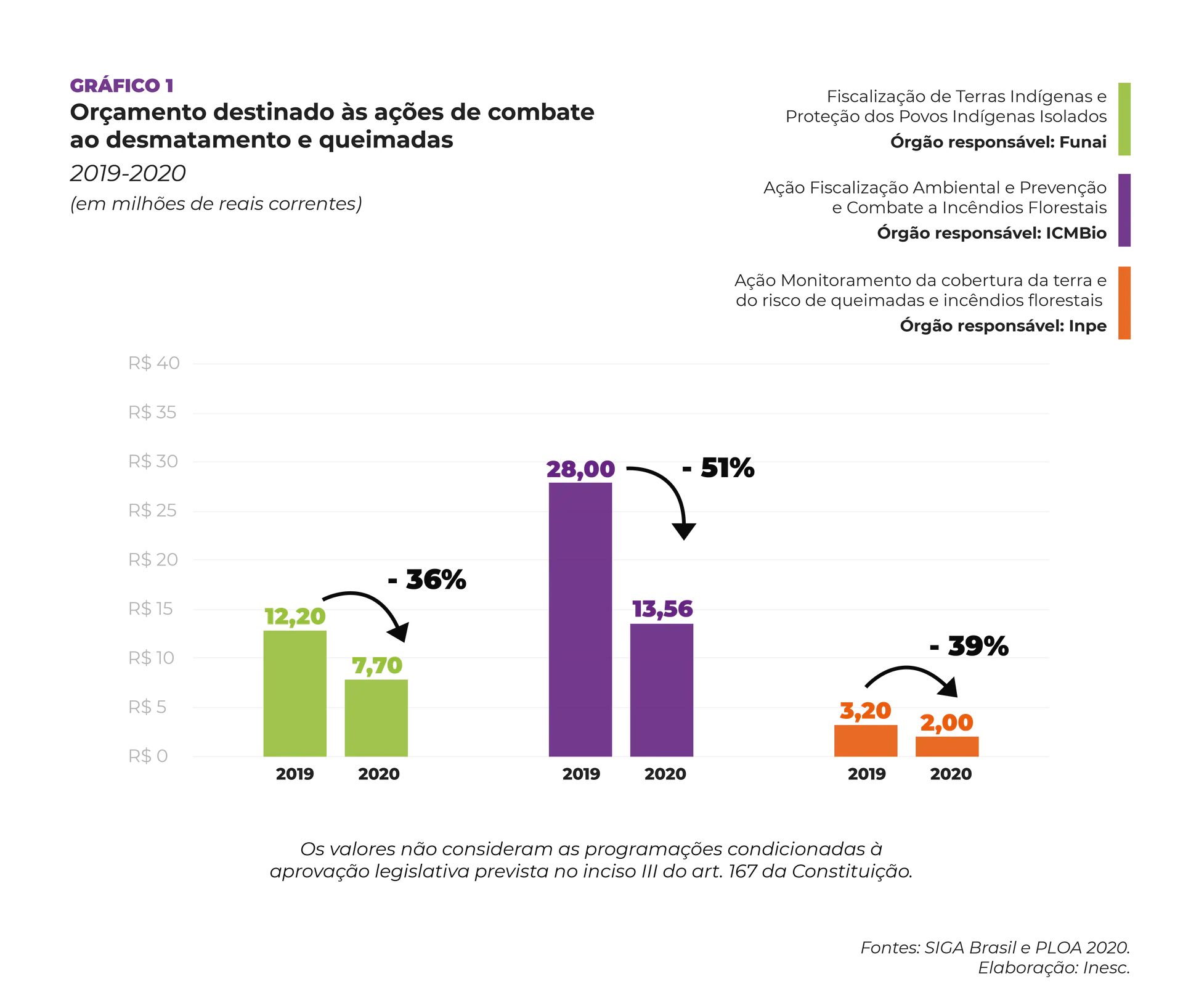 1) Nos sete primeiros meses de 2019, os gastos do governo com a ação de monitoramento da cobertura da terra e do risco de queimadas e incêndios florestais, realizada pelo Inpe, caíram 67% em relação ao mesmo período de 2018.