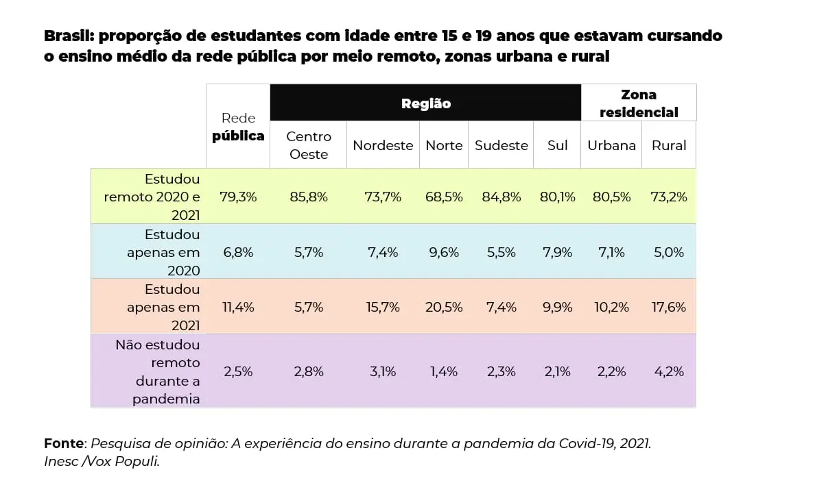 Também é crítico o cenário na região Norte, onde apenas 68% conseguiram ter aulas em 2020 e 2021, contra 84,8% no Sudeste e 80,1% no Sul, revelando a grande desigualdade no sistema educacional do País.