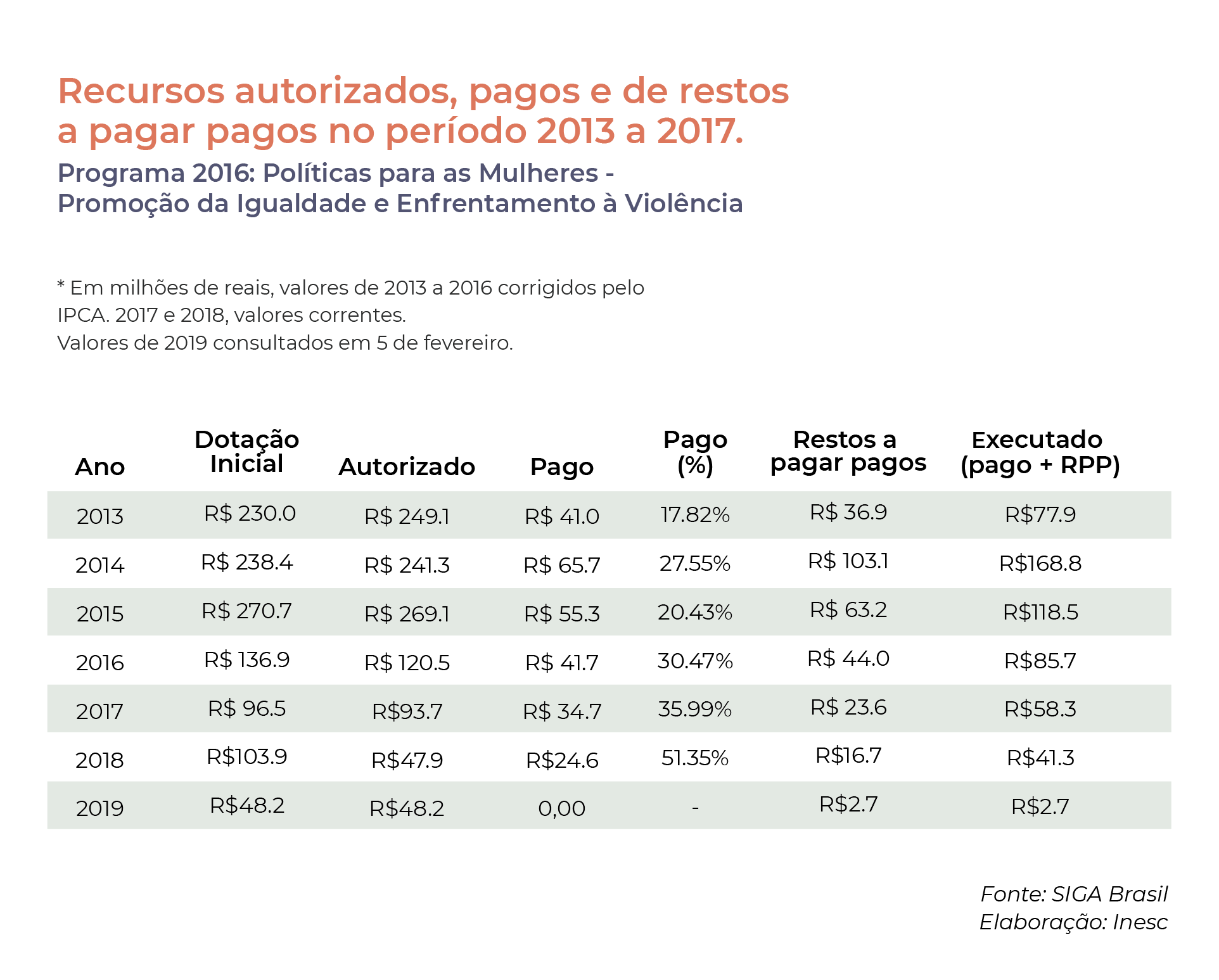 O cenário agora é desesperador: com a Emenda Constitucional 95, que estabeleceu o ‘teto de gastos’, o corte de despesas sofrido pela Secretaria Nacional de Políticas para as Mulheres (SPM) foi de 65% entre 2015 a 2018, em termos reais. Para cada R$ 1 cortado do orçamento das políticas para as mulheres entre 2015 e 2016, aumentou R$ 1,3 o orçamento para pagamento dos serviços da dívida pública (Inesc, Oxfam Brasil e CESR, 2017). A redução orçamentária chegou a 79% se compararmos os recursos alocados em 2019 em relação aos de 2013.