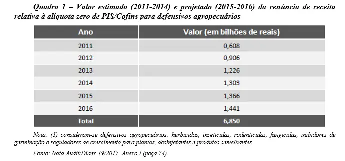 Aos fatos: somente entre 2011 e 2016 o Brasil deixou de arrecadar R$ 6,85 bilhões com a isenção fiscal da Contribuição para o Financiamento da Seguridade Social (Cofins) e do PIS/Pasep para o setor de agrotóxicos. Esses tributos são fundamentais para financiar a seguridade social, que inclui as áreas de saúde e assistência social. Os dados da Receita Federal, citados em auditoria do TCU, ainda são subestimados, pois não contemplam, por exemplo, o Imposto de Importação (II) e nem o Imposto sobre Produtos Industrializados (IPI), já que as desonerações desses produtos não configuram gasto tributário. E o cálculo não abrange a redução na base de cálculo do Imposto sobre Circulação de Mercadorias e Serviços (ICMS), por ser um tributo estadual.